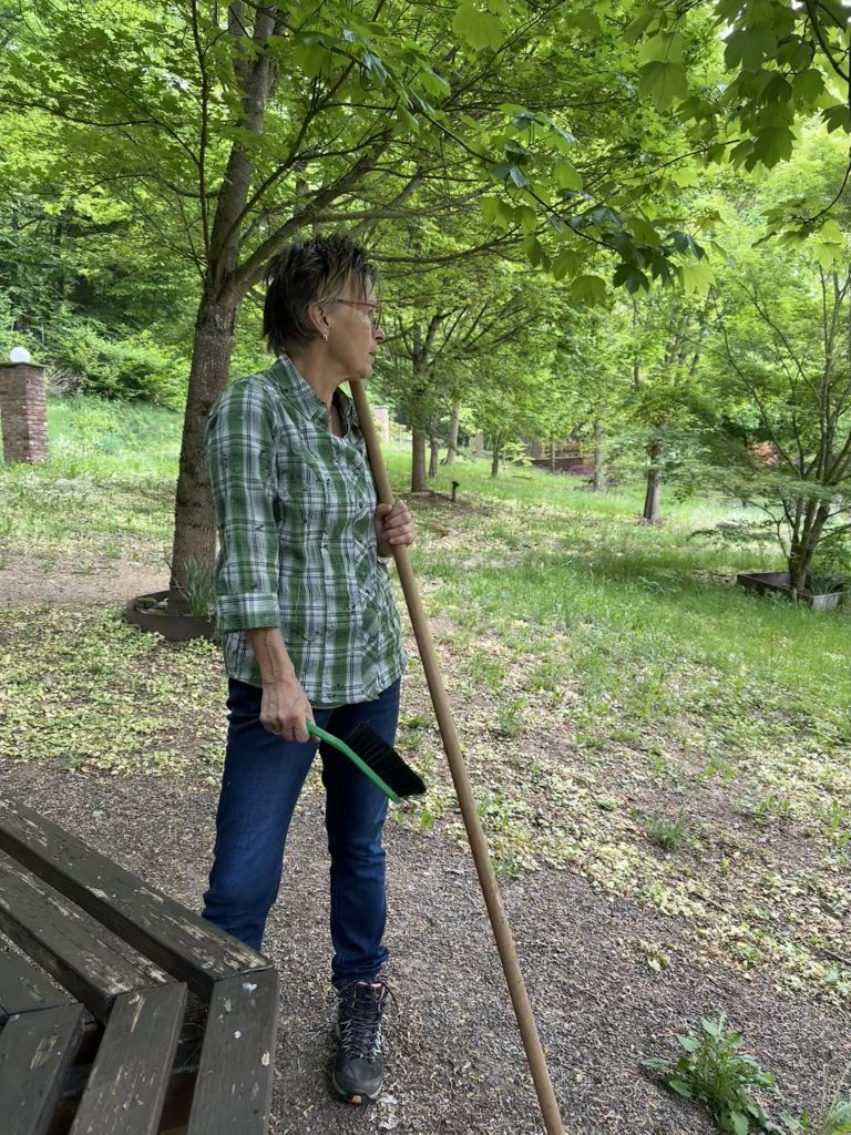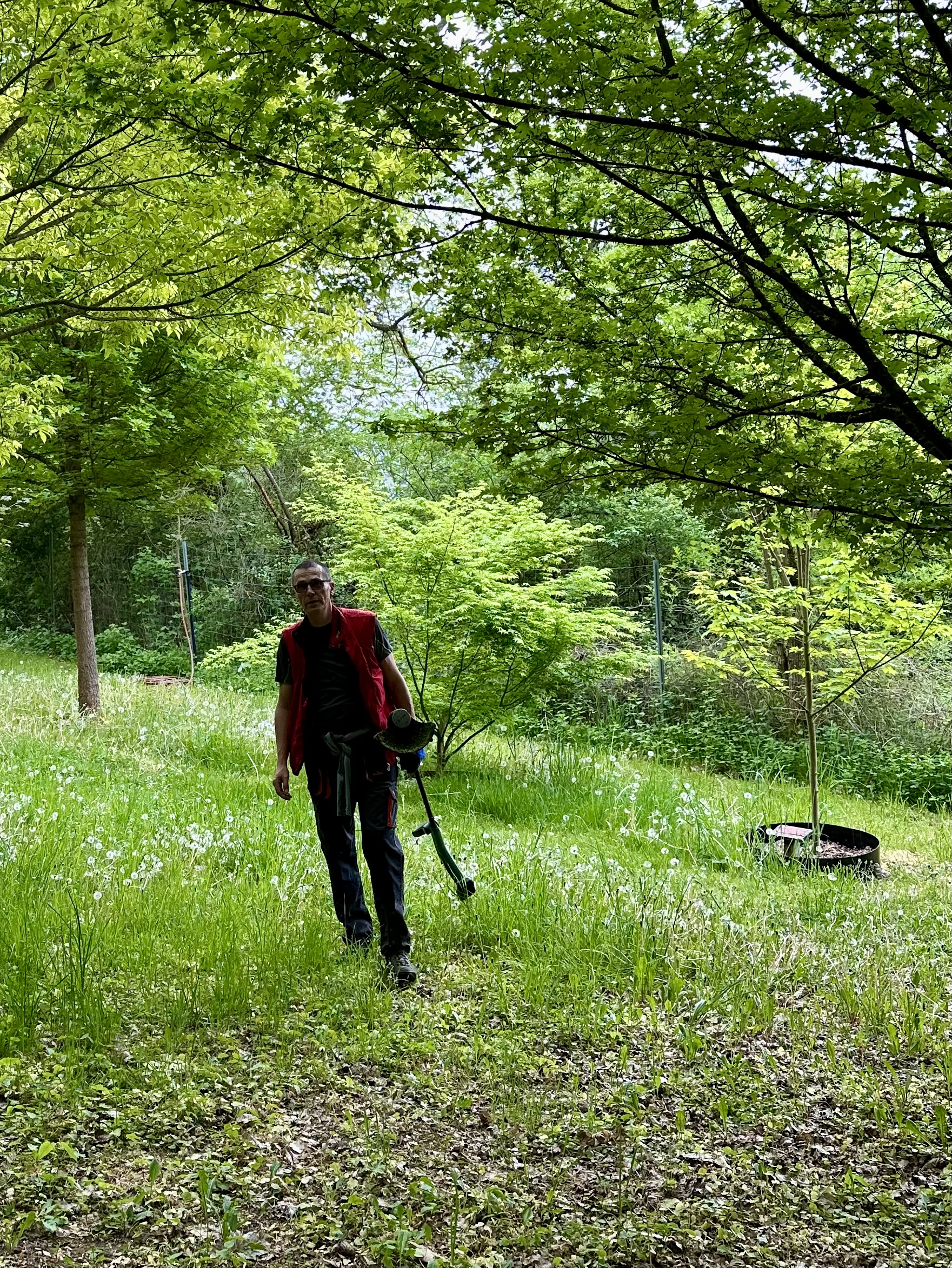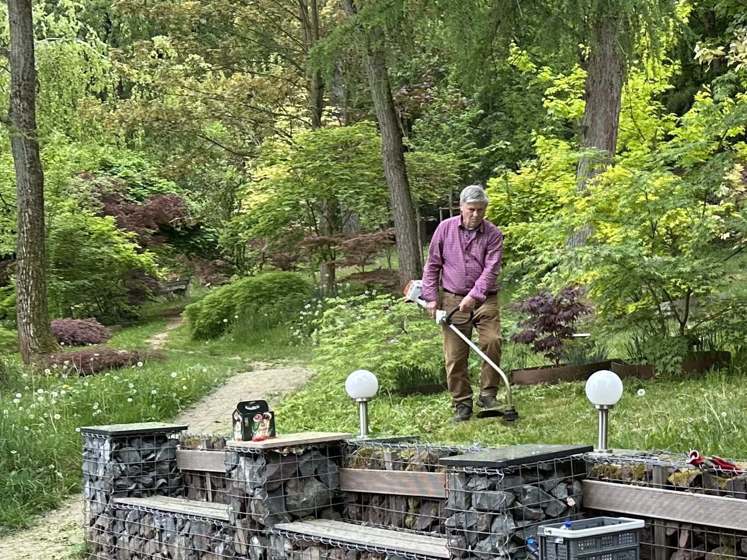 ….. Hämmern, Jäten Lachen, Mähen, Plaudern, Putzen, Sägen, Schleppen, Schruppen, Stutzen und noch vieles mehr, das alles „stand auf dem Zettel“ und Volker, Udo, Thomas, Martin, Markus, Mario, Jürgen, Judith, Gabriele, Friedhelm und Anna packten alle in der Woche vom 1. Mai tatkräftig mit an. Udo war schon in der Woche mit dem Rasentraktor „hin und her gefahren“ und hat laut Abacus des Mähwerkes 4.567.890 Pusteblumen abgemäht.