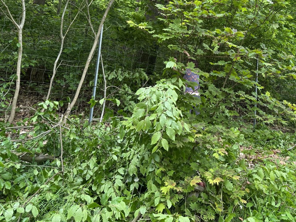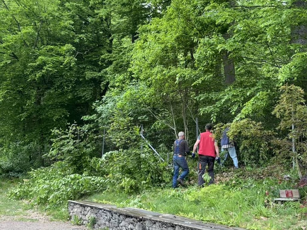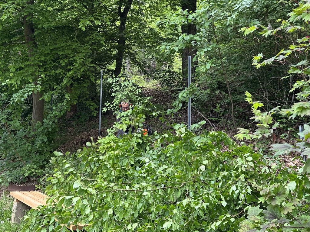 Die wohl körperlich forderndste Arbeit war, das wild hochgeschossene Gehölz am Zaun mit der Motorsäge zu fällen und gleich im Anschluss Beiseite zu schaffen. Heute starteten wir damit an der Nordseite oberhalb der Gabionen.