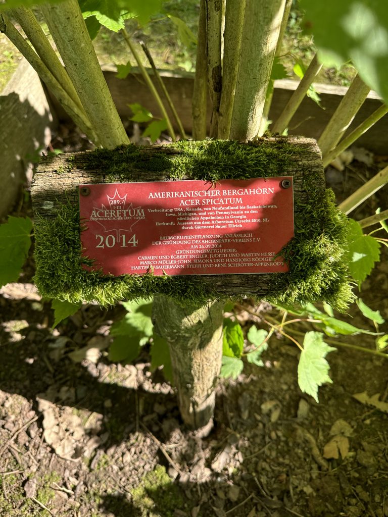 Vor ziemlich genau 10 Jahren, am 26. September 2014 gründete sich unser Ahornparkverein und bei unserem ersten Arbeitseinsatz als Vereinsmitglieder pflanzten wir neue Ahorne. An einem findet sich noch heute dieses „so schön in die Jahre gekommene“ Widmungsschild.