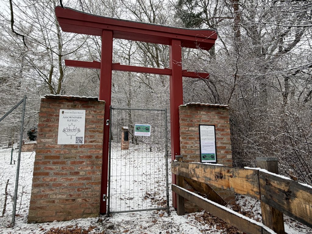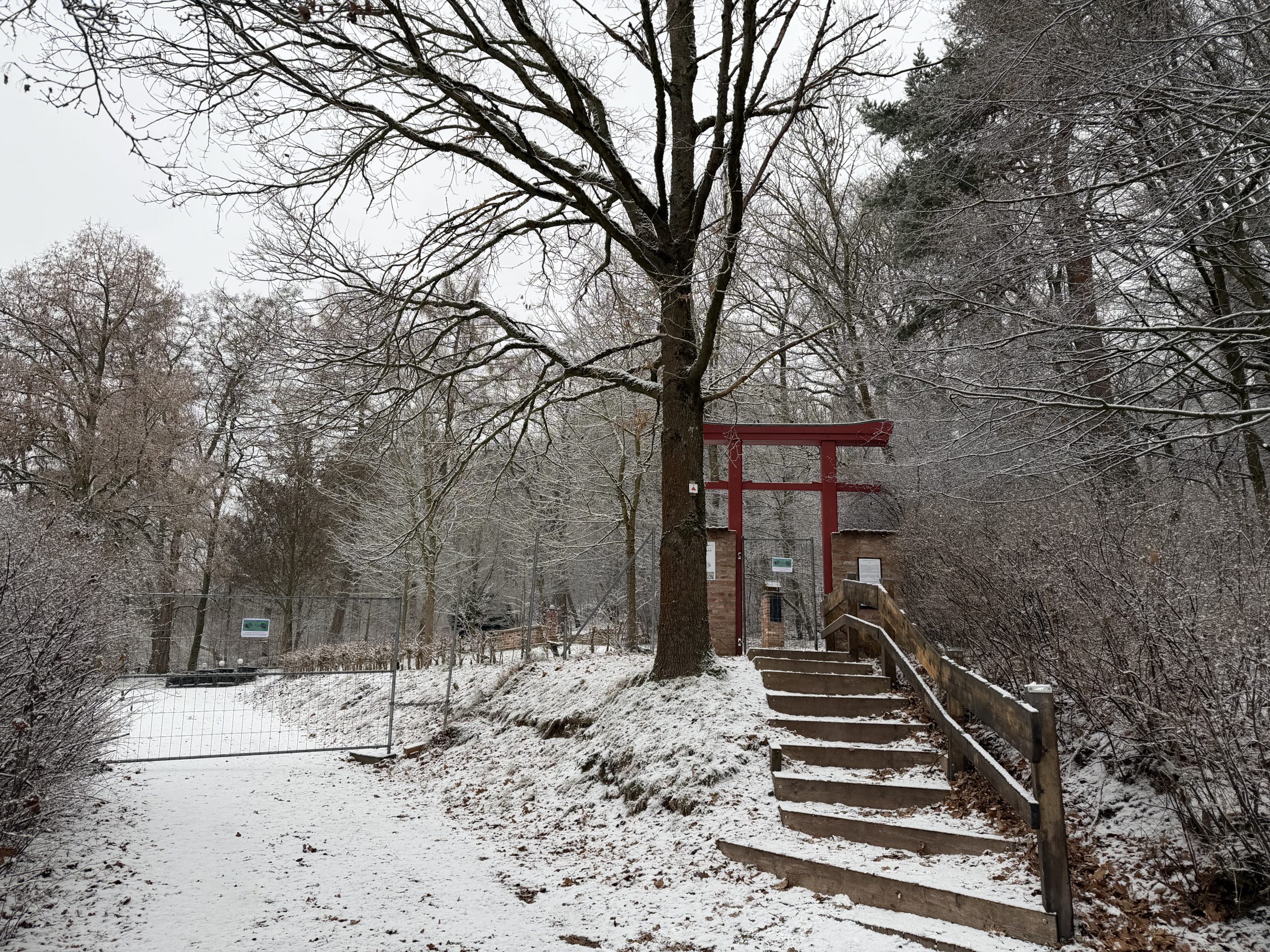 Im Winter müssen wir jedoch den Ahornpark vor dem Wild schützen. Hirsche und Rehe fegen mit ihren Geweihen die Stämme der Ahornbäume und Wildschweine verwüsten bei der Suche nach Früchten den Boden, wenn wir dem Wild den Zugang nicht verwehren. Deshalb haben wir die Einfahrt geschlossen und an das kleine Torii ein Gitter angebracht, so dass der Wildzaun seine Funktion erfüllen kann. Das Gitter am Torii kann von jedem jederzeit ganz einfach geöffnet und wieder verschlossen werden.
