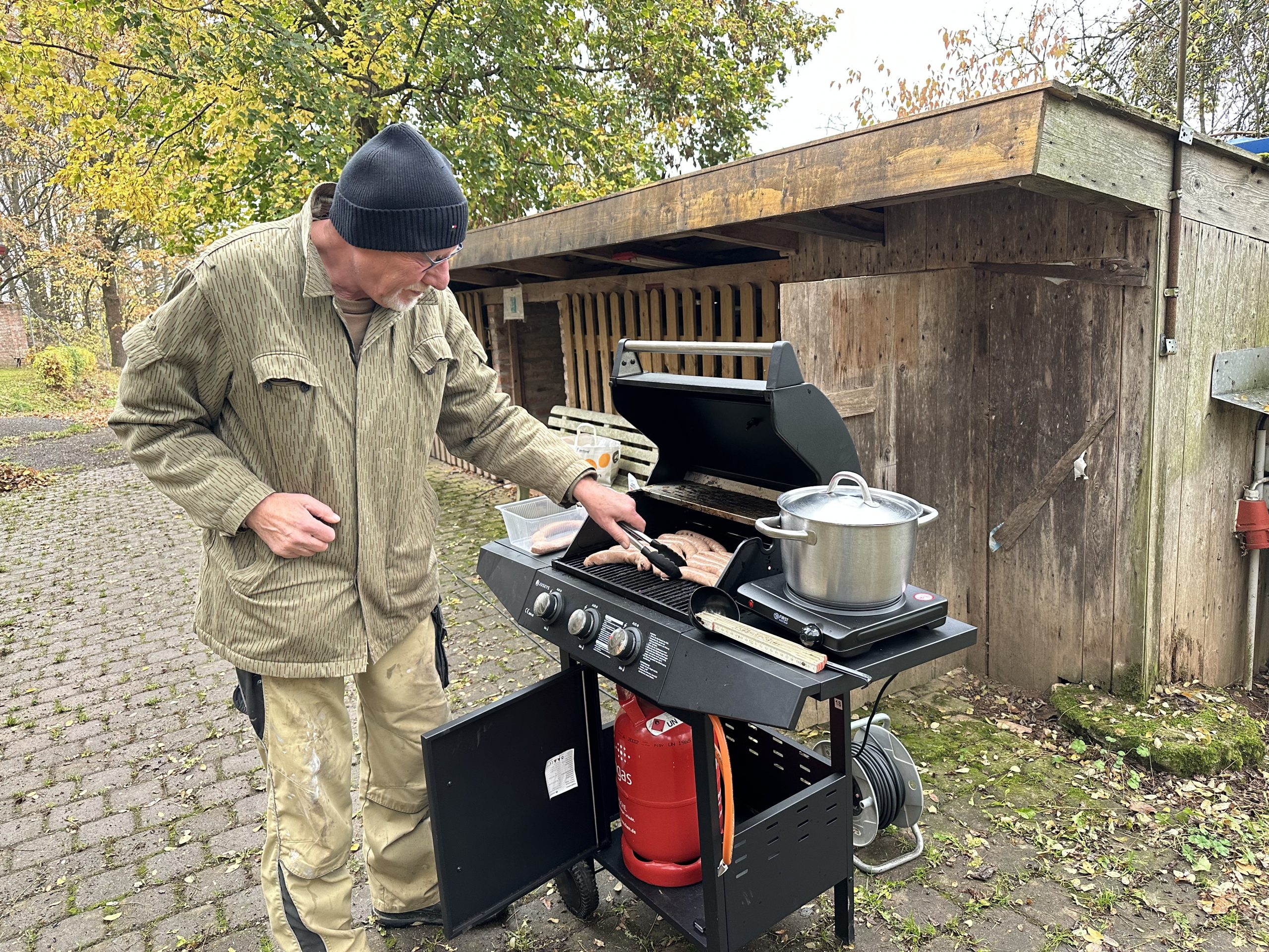 Nach getaner Arbeit gab es Rostbratwürste, für die „Süßen“ Apfelkuchen und warmen Tee und für den der wollte, „den ersten Glühwein“ in diesem Jahr.