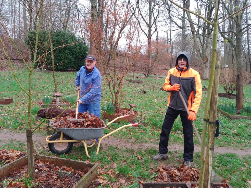 Wir haben das alte und schrecklich feuchte Laub mit großen Besen von den Dächern, den Wegen, der Wiese und unter den Bänken hervor gefegt, den Eingangsbereich beräumt und gefühlt hunderte Schubkarrenladungen mit eben diesem Laub aus dem Park gekarrt…