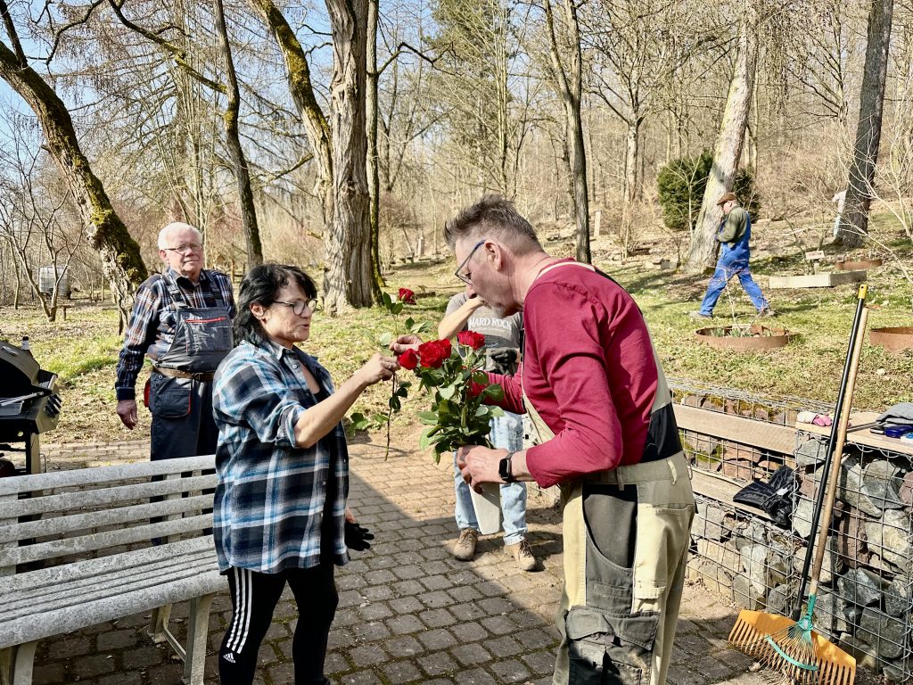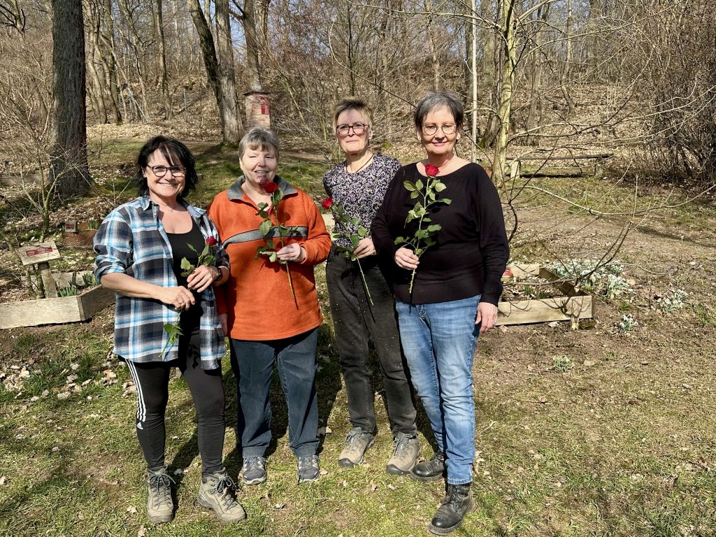 Ein wenig verstrubbelt, tüchtig verstaubt und auch nach mehr als 2 Stunden anstrengender Arbeit etwas ausgepowert freuten wir vier Frauen uns aufrichtig über die Glückwünsche zum Internationalen Frauentag und die Rosen, die uns unser Vereinsvorsitzender überreichte, welch` wirklich schöne Geste.