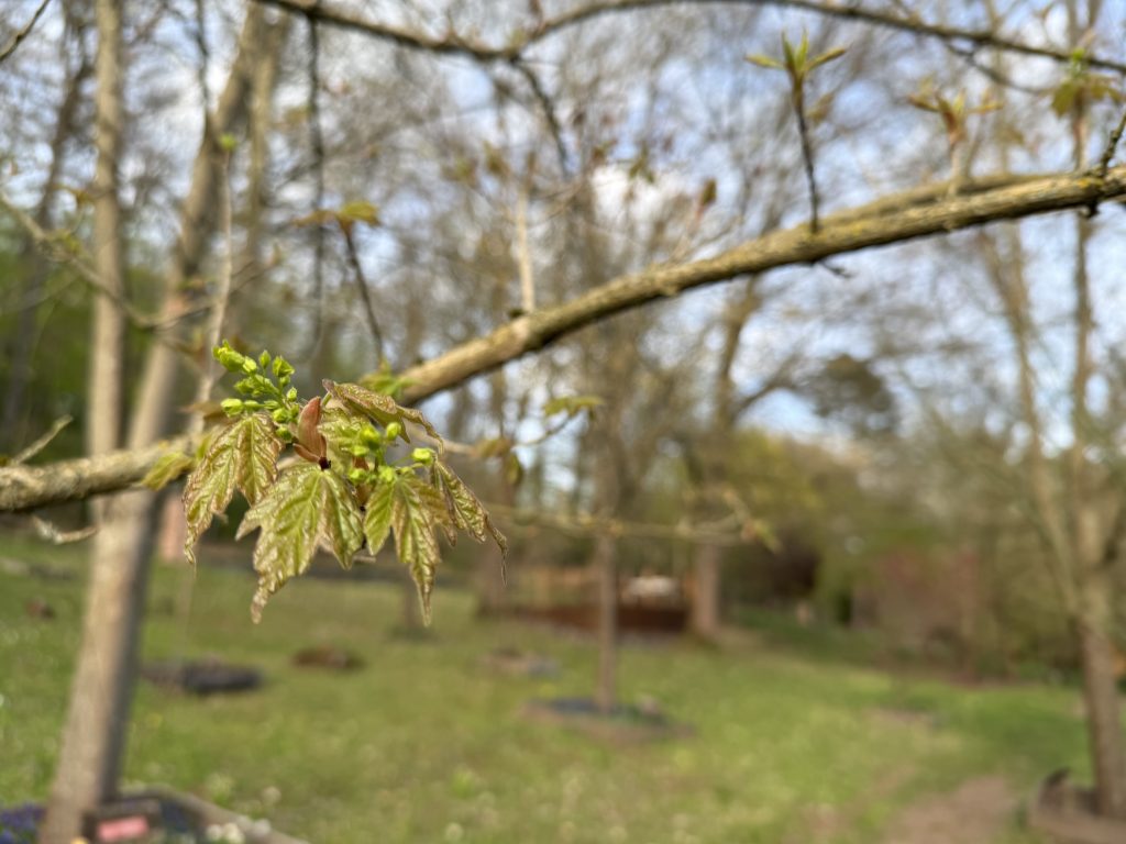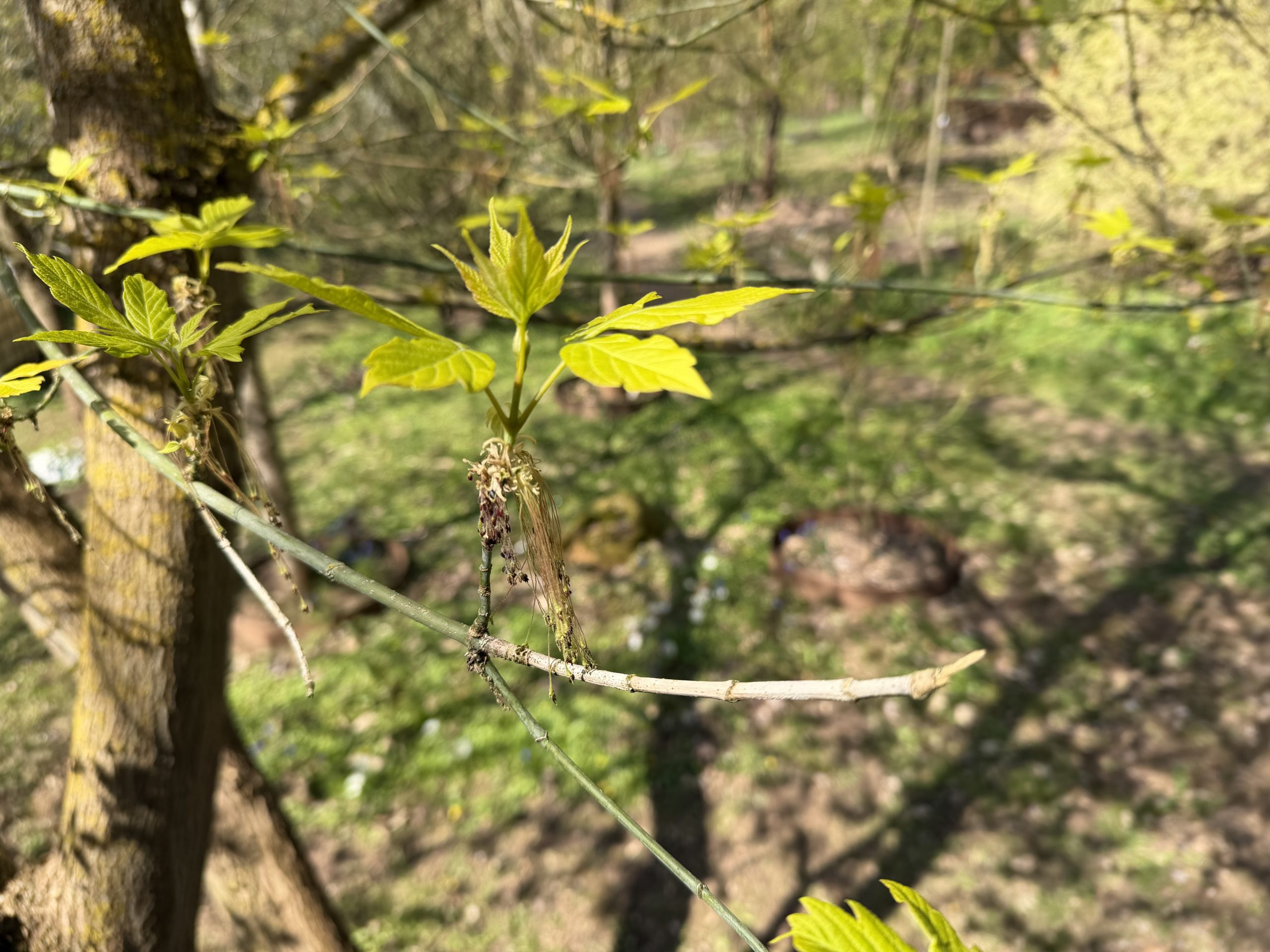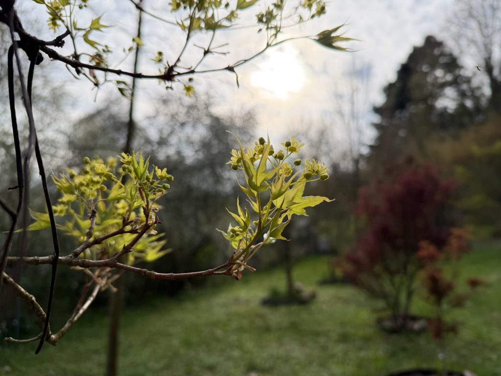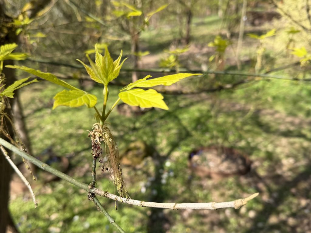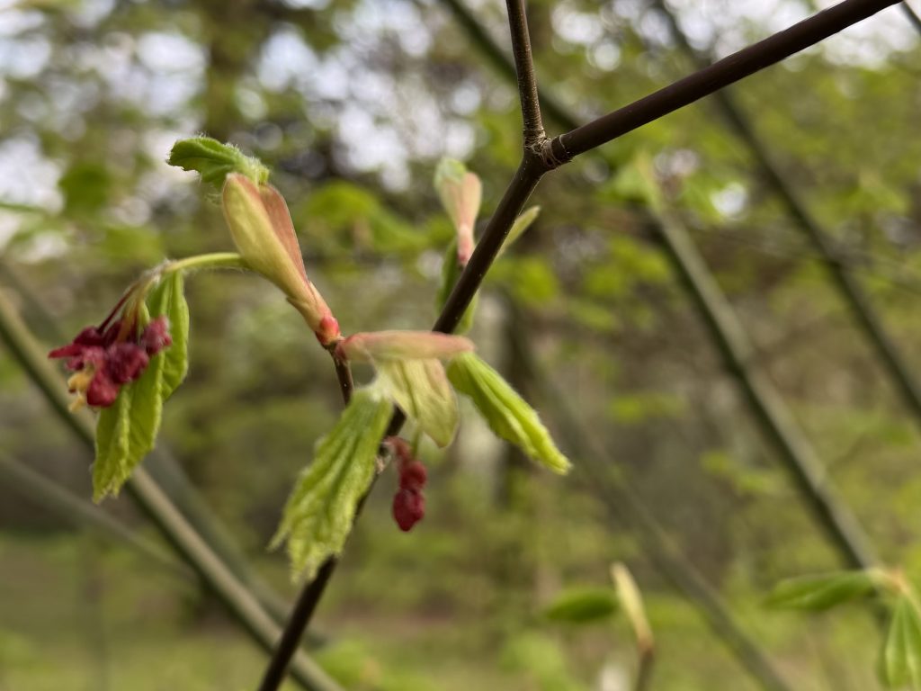 Es ist so schön, den Ahornpark beim Frühlingserwachen zu sehen, wie die bunten Frühblüher von den Ahornblüten und Blätterknospen abgelöst werden und wunderschönes frisches Grün und Rot im Sonnenlicht leuchtet.